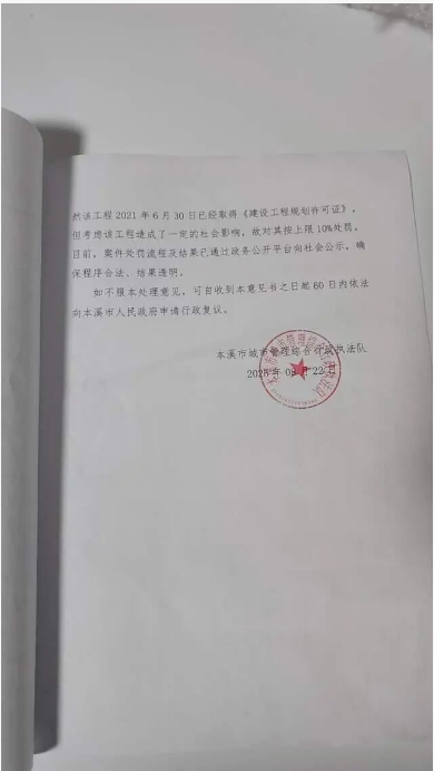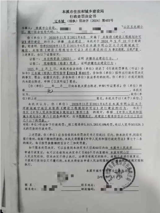 趙先生這才知道,這棟樓 2020 年 11 月就開工了,直到 2021 年 6 月才補到《建設工程規(guī)劃許可證》,相當于 “先上車后補票”。更讓他不解的是,2022 年明山區(qū)住建局曾罰過 2 萬,2025 年 2 月,本溪市城市管理綜合行政執(zhí)法局又給了 50.15 萬的罰單。