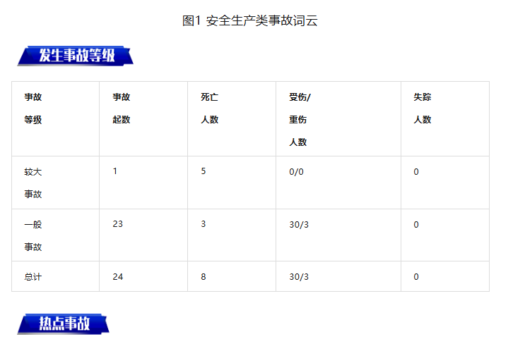 自2025-11-17 00:00:00至2025-11-23 23:59:59,全國報道安全生產(chǎn)類事故/事件共24起,(平臺推送2起,如需訂閱突發(fā)事件信息,請關(guān)注本文末端公眾號);跟蹤事故信息2起,(跟蹤內(nèi)容可在“中國安全生產(chǎn)大數(shù)據(jù)平臺”網(wǎng)站的“突發(fā)事件”版塊查看,網(wǎng)址見本文末端),共造成死亡8人,受傷30人,其中重傷3人。詞云見圖1。