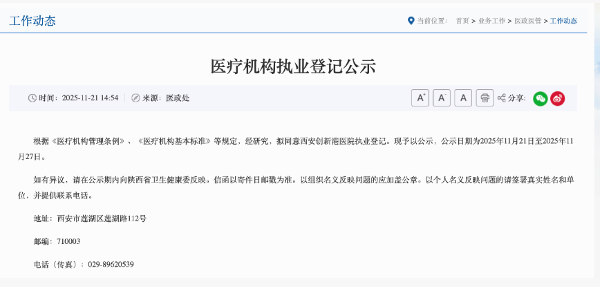 近日,陜西省衛(wèi)健委官網(wǎng)公示了一則醫(yī)療機構(gòu)執(zhí)業(yè)登記,根據(jù)《醫(yī)療機構(gòu)管理條例》《醫(yī)療機構(gòu)基本標準》等規(guī)定,經(jīng)研究,擬同意西安創(chuàng)新港醫(yī)院執(zhí)業(yè)登記?,F(xiàn)予以公示,公示日期為2025年11月21日至2025年11月27日。