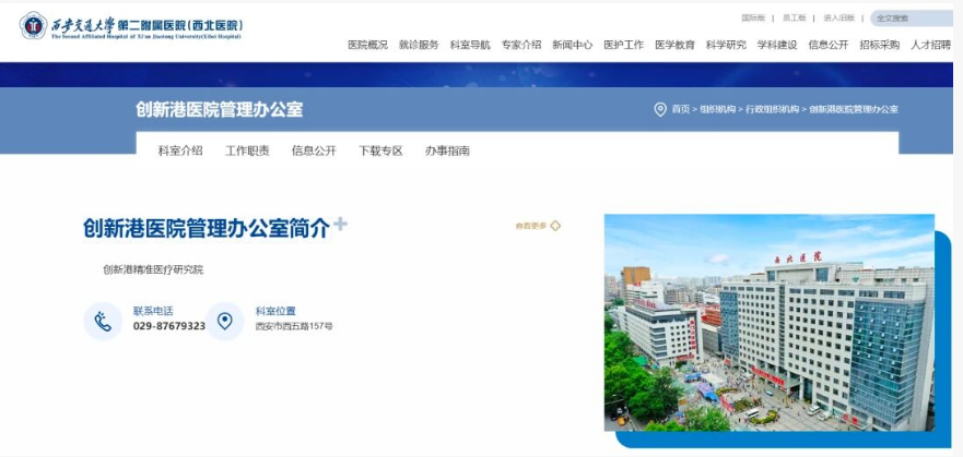 在西安交通大學第二附屬醫(yī)院的官網(wǎng)上,則有創(chuàng)新港醫(yī)院管理辦公室的專題頁面。