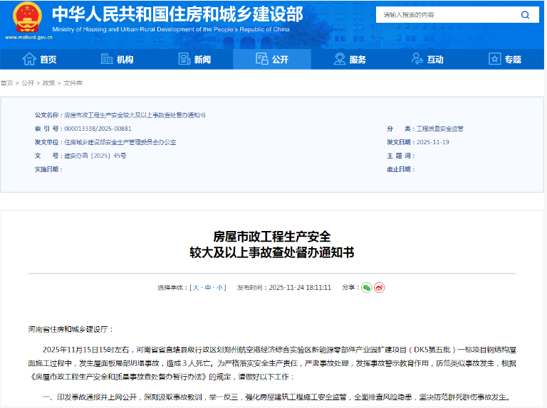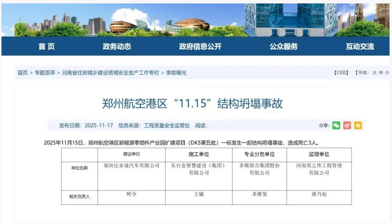 澎湃新聞此前報(bào)道,河南省住房和城鄉(xiāng)建設(shè)廳網(wǎng)站11月17日通報(bào),2025年11月15日,鄭州航空港區(qū)新能源零部件產(chǎn)業(yè)園擴(kuò)建項(xiàng)目(DK5第五批)一標(biāo)發(fā)生一起結(jié)構(gòu)坍塌事故,造成死亡3人。