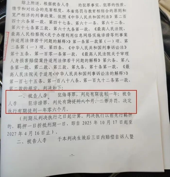 最終,法院判決被告人李某犯侮辱罪,判處有期徒刑一年;被告人李某犯誹謗罪,判處有期徒刑八個(gè)月。二罪并罰,決定執(zhí)行有期徒刑一年零六個(gè)月。