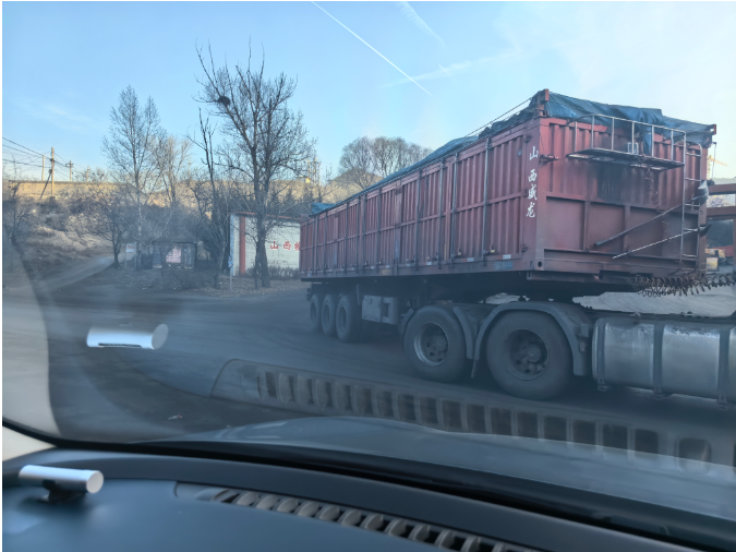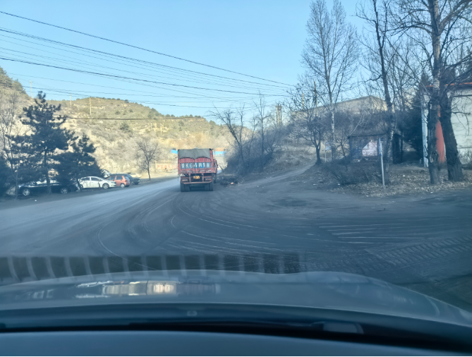據村民描述,北山煤業(yè)日常運輸煤炭的車輛往來頻繁,但所有運輸車輛均未采取任何密閉覆蓋措施,煤炭在運輸過程中不斷從車廂散落,導致廠區(qū)周邊及連接村莊的主要道路上布滿厚厚的煤面。車輛碾壓后,煤塵隨風四處飄散,形成漫天“黑霧”,無論是晴天還是陰天,道路兩側的農田、房屋、樹木都被煤塵覆蓋,原本干凈的村莊儼然變成了“黑灰世界”。