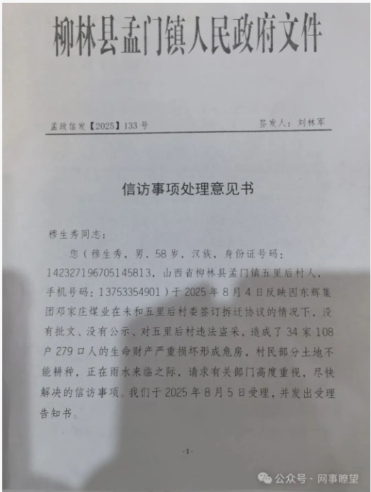 面對(duì)村民的訴求,孟門鎮(zhèn)政府于2025年10月27日出具了《信訪事項(xiàng)處理意見書》(孟政信發(fā)【2025】133號(hào))。根據(jù)該意見書顯示,2023年11月,因鄧家莊煤業(yè)采掘部署調(diào)整,五里后村需實(shí)施整村搬遷,當(dāng)時(shí)近100%村民同意搬遷,但在得知具體賠償標(biāo)準(zhǔn)后,村民們普遍提出異議;此后,鄧家莊煤業(yè)變更采掘方案獲相關(guān)部門批準(zhǔn),整村搬遷工作隨之陷入停滯。