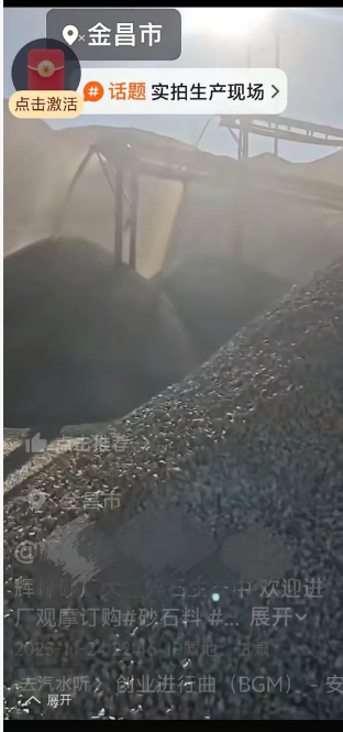 甘肅省金昌市輝峰砂石廠,廠區(qū)內缺少必要的防護措施大量原料露天堆放,露天作業(yè),距離居民區(qū)很近,揚塵污染難控制。
