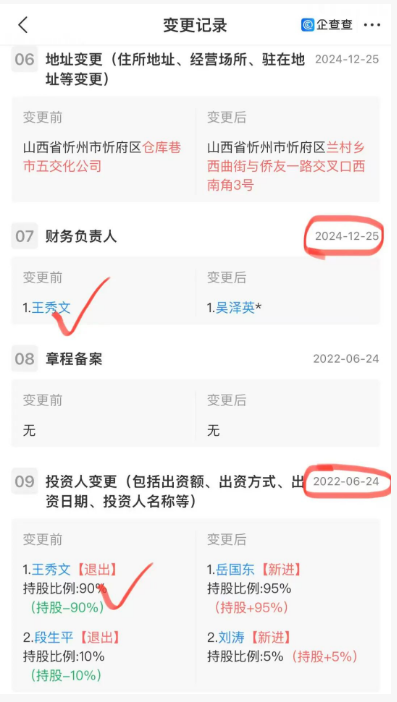 更值得關注的是,王秀文并非“單純入股”,而是深度參與企業(yè)運營——他長期擔任浩弘盛公司財務負責人,直至2024年12月25日,才將財務負責人身份變更為吳澤英。