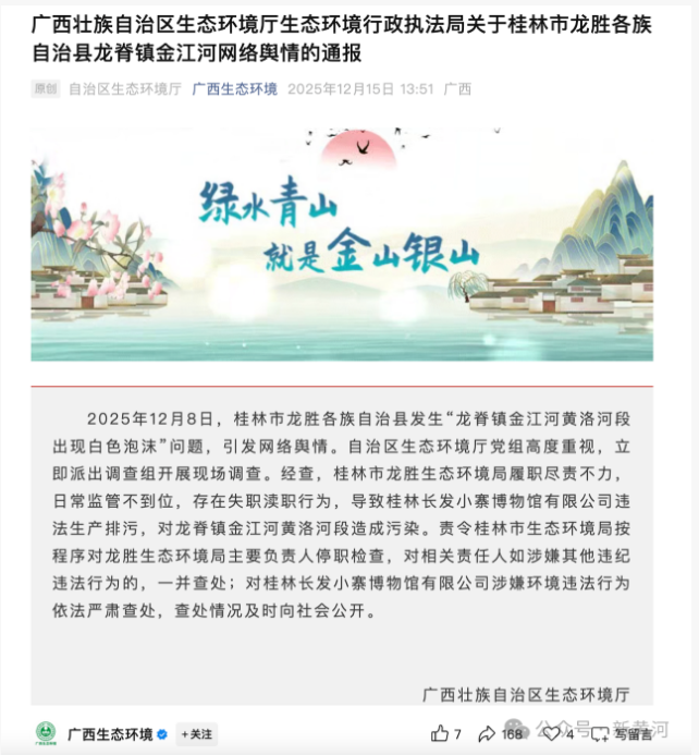 12月8日,桂林市龍勝各族自治縣發(fā)生“龍脊鎮(zhèn)金江河黃洛河段出現(xiàn)白色泡沫”問題,引發(fā)網(wǎng)絡(luò)輿情。自治區(qū)生態(tài)環(huán)境廳黨組高度重視,立即派出調(diào)查組開展現(xiàn)場調(diào)查。經(jīng)查,桂林市龍勝生態(tài)環(huán)境局履職盡責(zé)不力,日常監(jiān)管不到位,存在失職瀆職行為,導(dǎo)致桂林長發(fā)小寨博物館有限公司違法生產(chǎn)排污,對龍脊鎮(zhèn)金江河黃洛河段造成污染。責(zé)令桂林市生態(tài)環(huán)境局按程序?qū)垊偕鷳B(tài)環(huán)境局主要負(fù)責(zé)人停職檢查,對相關(guān)責(zé)任人如涉嫌其他違紀(jì)違法行為的,一并查處;對桂林長發(fā)小寨博物館有限公司涉嫌環(huán)境違法行為依法嚴(yán)肅查處,查處情況及時向社會公開。