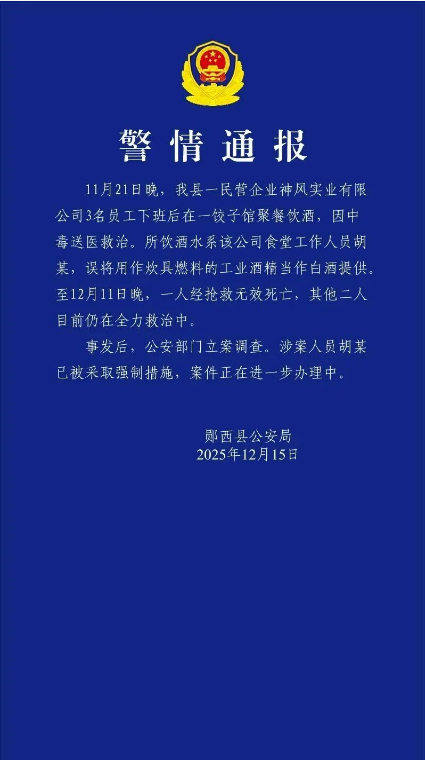 11月21日晚,我縣一民營(yíng)企業(yè)神風(fēng)實(shí)業(yè)有限公司3名員工下班后在一餃子館聚餐飲酒,因中毒送醫(yī)救治。所飲酒水系該公司食堂工作人員胡某,誤將用作炊具燃料的工業(yè)酒精當(dāng)作白酒提供。至12月11日晚,一人經(jīng)搶救無(wú)效死亡,其他二人目前仍在全力救治中。