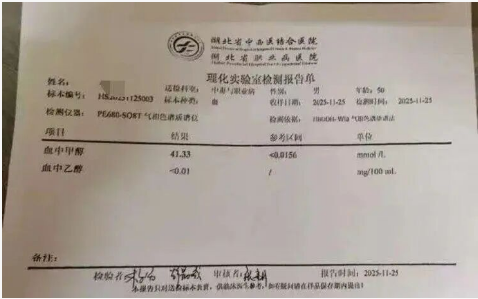 某某血中甲醇含量為41.33mmol/L。圖片來(lái)源/受訪者供圖