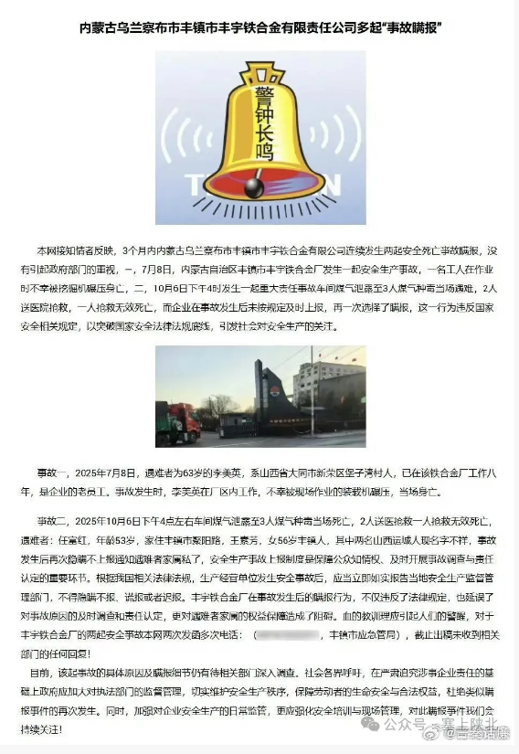 亊故二,2025年10月6日下午4點左右車間煤氣泄露至3人煤氣種毒當(dāng)場死亡,2人送醫(yī)搶救一人搶救無效死亡,遇難者:任富紅,年齡53歲,家住豐鎮(zhèn)市聚陽路,王素芳,女56歲豐鎮(zhèn)人,其中兩名山西運城人現(xiàn)名字不祥,事故發(fā)生后再次隱瞞不上報通知遇難者家屬私了,安全生產(chǎn)事故上報制度是保障公眾知情權(quán)、及時開展事故調(diào)查與責(zé)任認(rèn)定的重要環(huán)節(jié)。根據(jù)我國相關(guān)法律法規(guī),生產(chǎn)經(jīng)營單位發(fā)生安全事故后,應(yīng)當(dāng)立即如實報告當(dāng)?shù)匕踩a(chǎn)監(jiān)督管理部門,不得隱瞞不報、謊報或者遲報。豐宇鐵合金廠在事故發(fā)生后的瞞報行為,不僅違反了法律規(guī)定,也延誤了對事故原因的及時調(diào)查和責(zé)任認(rèn)定,更對遇難者家屬的權(quán)益保障造成了阻礙。血的教訓(xùn)理應(yīng)引起人們的警醒,對于豐宇鐵合金廠的兩起安全亊故本網(wǎng)兩次發(fā)函多次電話:(0474/3222311,豐鎮(zhèn)市應(yīng)急管局),截止出稿未收到相關(guān)部門的任何回復(fù)!