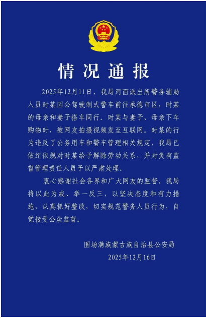 2025年12月11日,我局河西派出所警務(wù)輔助人員時(shí)某因公駕駛制式警車前往承德市區(qū),時(shí)某的母親和妻子搭車同行。時(shí)某與妻子、母親下車購(gòu)物時(shí),被網(wǎng)友拍攝視頻發(fā)至互聯(lián)網(wǎng)。