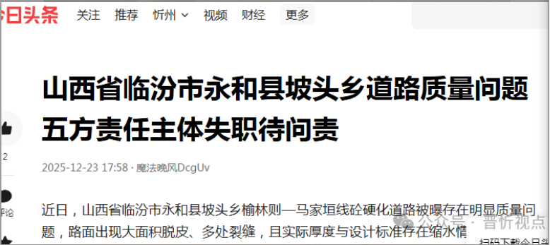 近日,山西省臨汾市永和縣坡頭鄉(xiāng)榆林則—馬家垣線砼硬化道路被曝存在明顯質(zhì)量問題,路面出現(xiàn)大面積脫皮、多處裂縫,且實(shí)際厚度與設(shè)計(jì)標(biāo)準(zhǔn)存在縮水情況,不僅影響群眾日常出行安全,更造成公共資金浪費(fèi),引發(fā)社會(huì)關(guān)注。針對(duì)該問題,需從五個(gè)關(guān)鍵層面精準(zhǔn)問責(zé),推動(dòng)責(zé)任倒查與整改落實(shí):