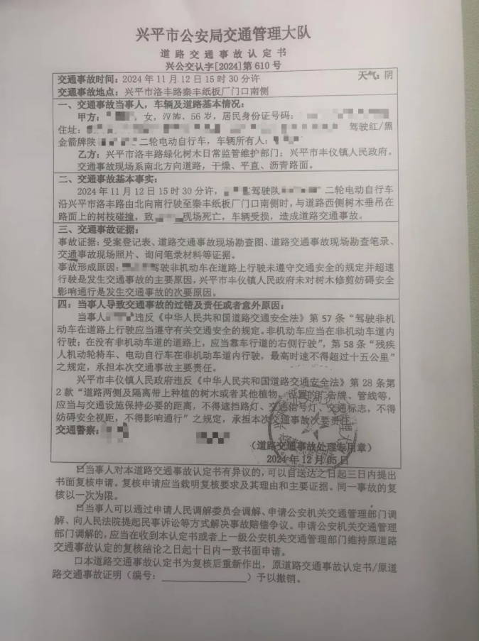 2024年12月5日,興平市公安局交警大隊開具的《道路交通事故認(rèn)定書》稱,事發(fā)當(dāng)日,白琳駕駛電動車沿洛豐路由北向南行駛時,與道路西側(cè)樹木垂吊在路面上的樹枝碰撞,致其現(xiàn)場死亡,車輛受損,造成道路交通事故。