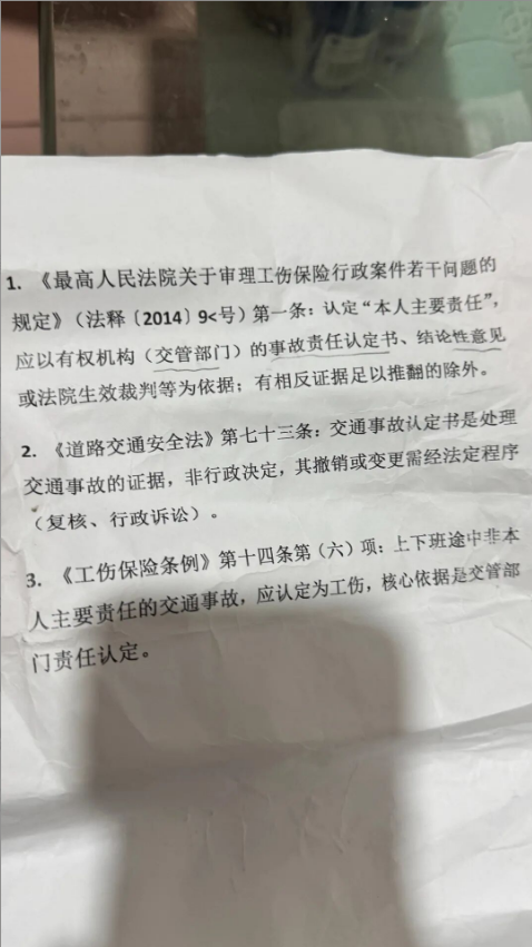 記者采訪趙正時,他拿出一張此前從人社局拿回的A4紙,上面打印了有關(guān)工傷認(rèn)定的法律法規(guī)。他認(rèn)為,其中第1條提到的“事故責(zé)任認(rèn)定書、結(jié)論性意見或法院生效判決”,為并列關(guān)系,而非人社局所理解的存在優(yōu)先級關(guān)系。