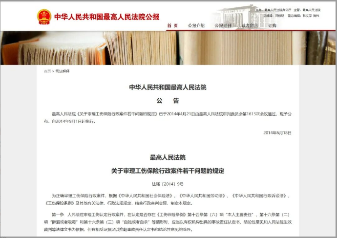 九派新聞檢索發(fā)現(xiàn),最高人民法院公報網(wǎng)站載明,《最高人民法院關(guān)于審理工傷保險行政案件若干問題的規(guī)定》(法釋〔2014〕9號)第一條,法院審理工傷認(rèn)定行政案件,在認(rèn)定是否存在《工傷保險條例》第十四條第(六)項“本人主要責(zé)任”等情形時,應(yīng)當(dāng)以有權(quán)機(jī)構(gòu)出具的事故責(zé)任認(rèn)定書、結(jié)論性意見和人民法院生效裁判等法律文書為依據(jù),但有相反證據(jù)足以推翻事故責(zé)任認(rèn)定書和結(jié)論性意見的除外。即其中的連接詞為“和”,而非“或”。