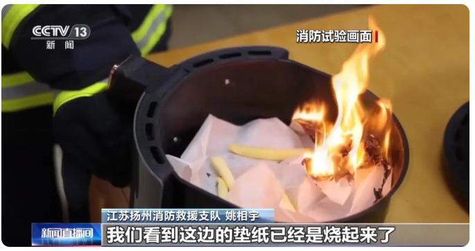 隨后,消防員又更換了一張尺寸明顯大于托盤的墊紙放入鍋內(nèi)。啟動空氣炸鍋后,很快在空氣炸鍋的出氣口處聞到了更濃烈的氣味兒。空氣炸鍋里的墊紙此時已經(jīng)燃燒了起來,如果沒有及時發(fā)現(xiàn)和處置,后果不堪設(shè)想。