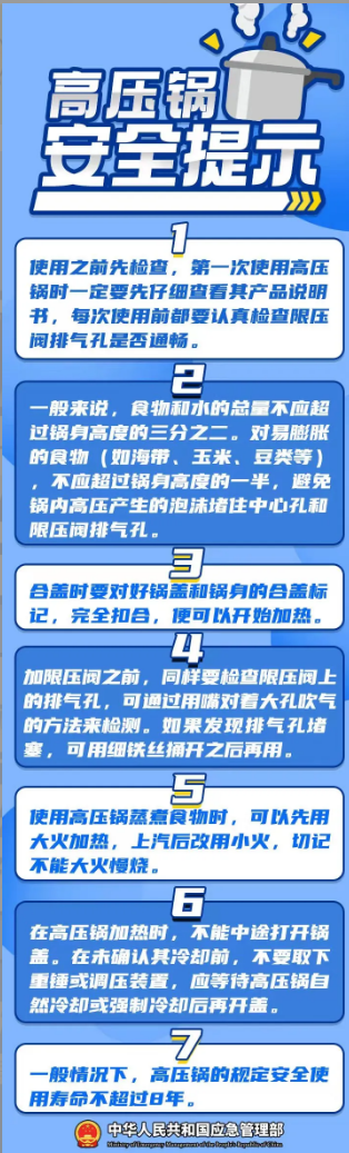 消防部門提醒,高壓鍋在使用前要檢查排氣閥與安全閥是否暢通、密封圈是否完好、鍋蓋鍋身是否閉合正常;使用中要控制食物量不超鍋體三分之二、加熱時專人看護不離場、開蓋前確認完全泄壓。同時,還要定期更換老化密封圈,從源頭上規(guī)避安全風(fēng)險。